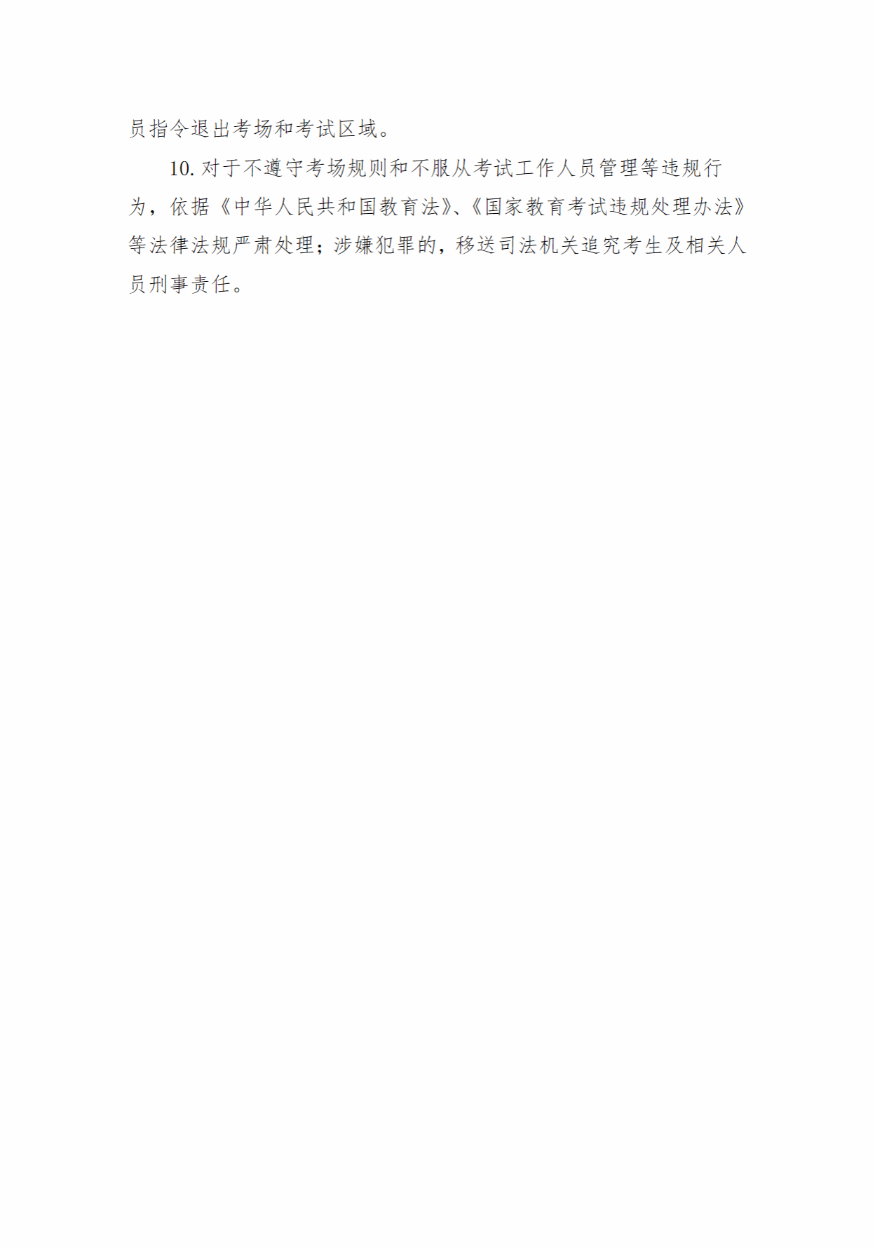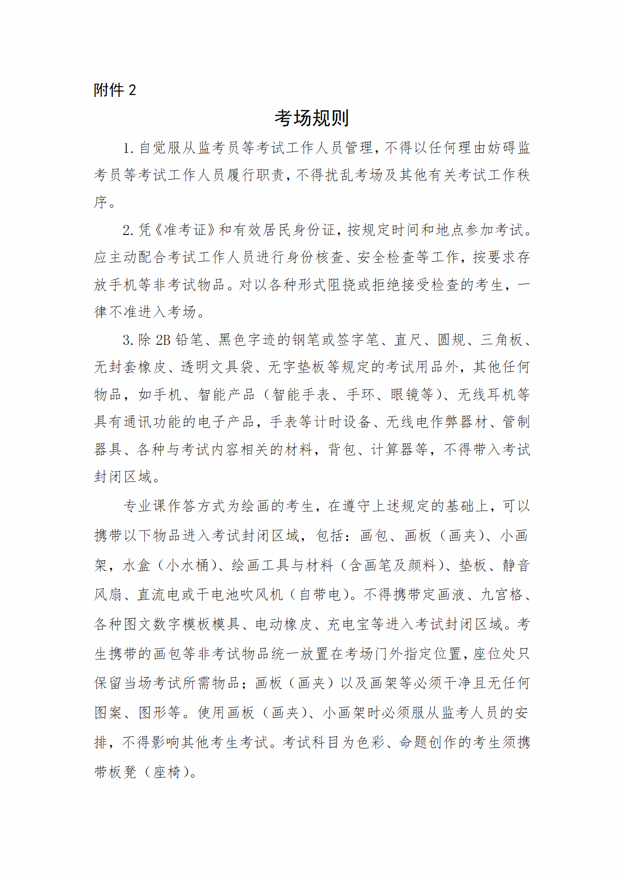 3.严格遵守法律法规。考场内均安装视频监控系统,考试期间全程录像。考生须自觉遵守《考场规则》(附件2),配合考试工作人员做好身份验证和违禁物品检查。对于不遵守《考场规则》、不服从监考员等考试工作人员管理等违规行为,将按照《中华人民共和国教育法》《国家教育考试违规处理办法》等法律法规严肃处理;涉嫌犯罪的,移送司法机关追究法律责任。