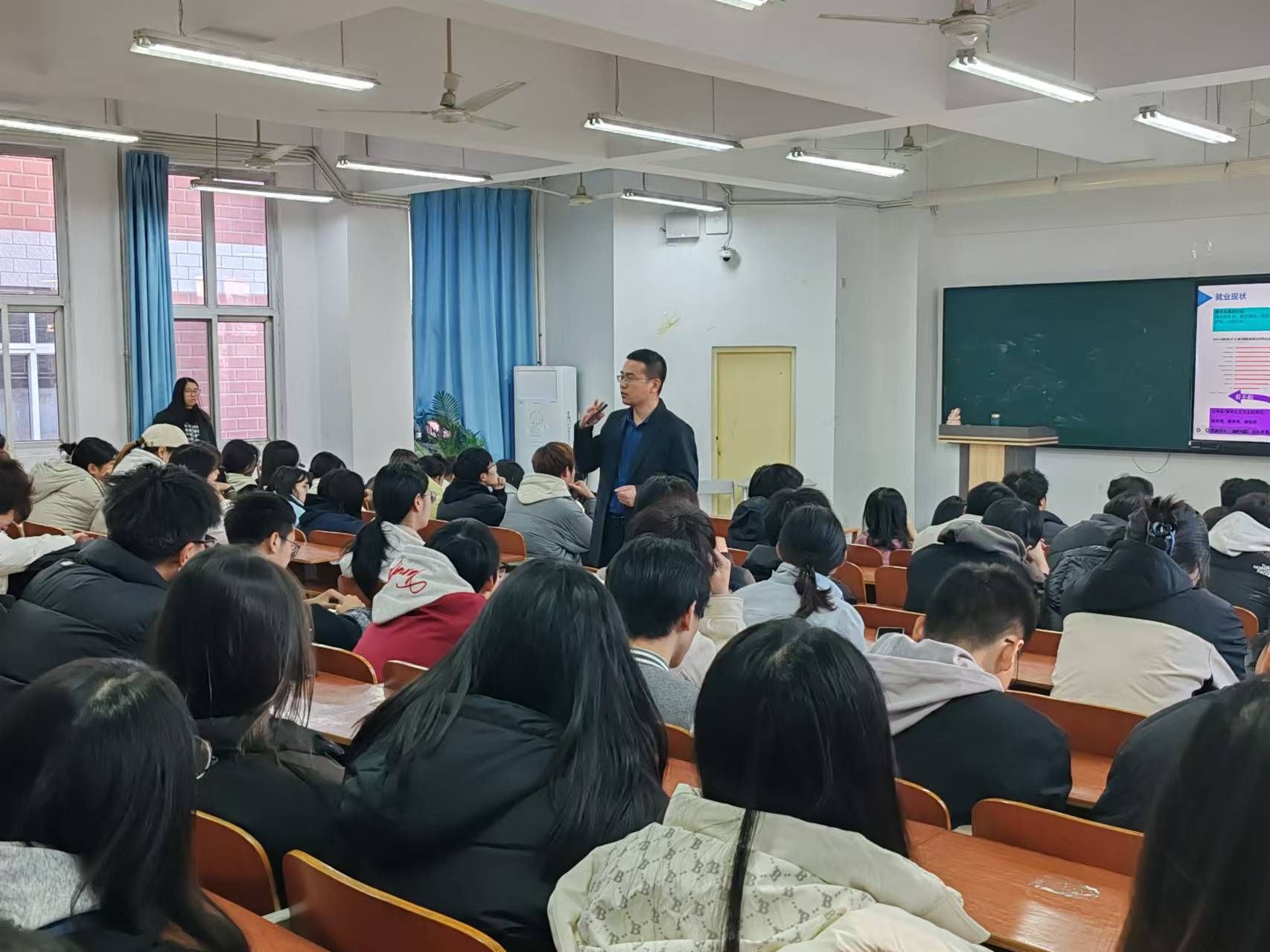 互动交流环节。赵老师提问学生们对未来职业的规划和对目标工作的了解程度,激发了学生们的思考和讨论。学生们积极分享自己的职业理想,并就求职过程中遇到的问题向赵老师请教。通过互动,学生们更加明确了自己的职业方向,也为未来的就业之路奠定了基础。最后,赵老师鼓励学生们多与老师沟通交流,寻求就业建议,并祝愿学生们在未来的开启个人职业新天地。
