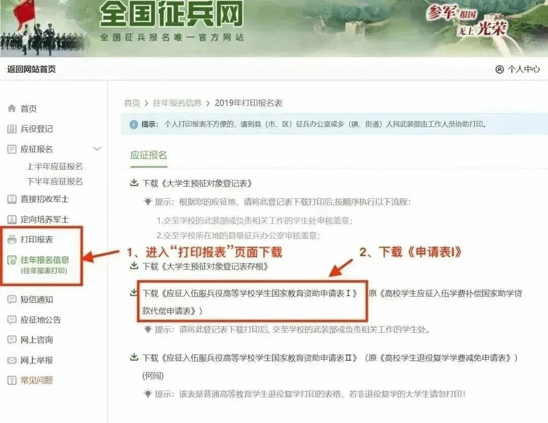 可登录全国征兵网大学生征兵报名系统,进入“打印报表”页面下载《应征入伍服兵役高等学校学生国家教育资助申请表Ⅰ》(一式两份,以下简称《申请表》)并按要求填写相关信息。