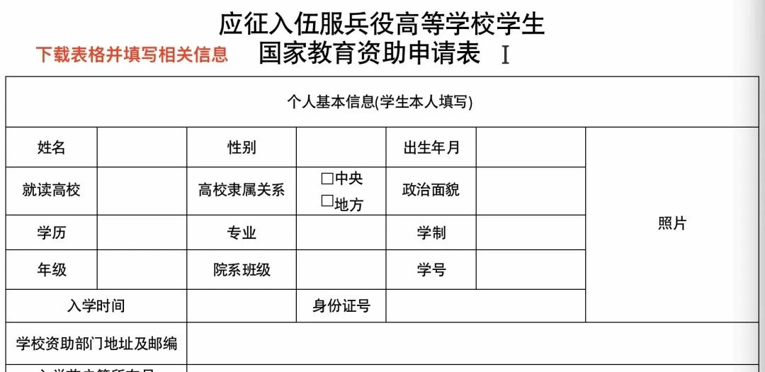 下载打印《申请表》后,须到县级征兵办审核加盖公章。(入伍地为学校的学生可提出申请,将材料交由学校统一办理,具体情况请咨询学校武装部或学生资助中心)