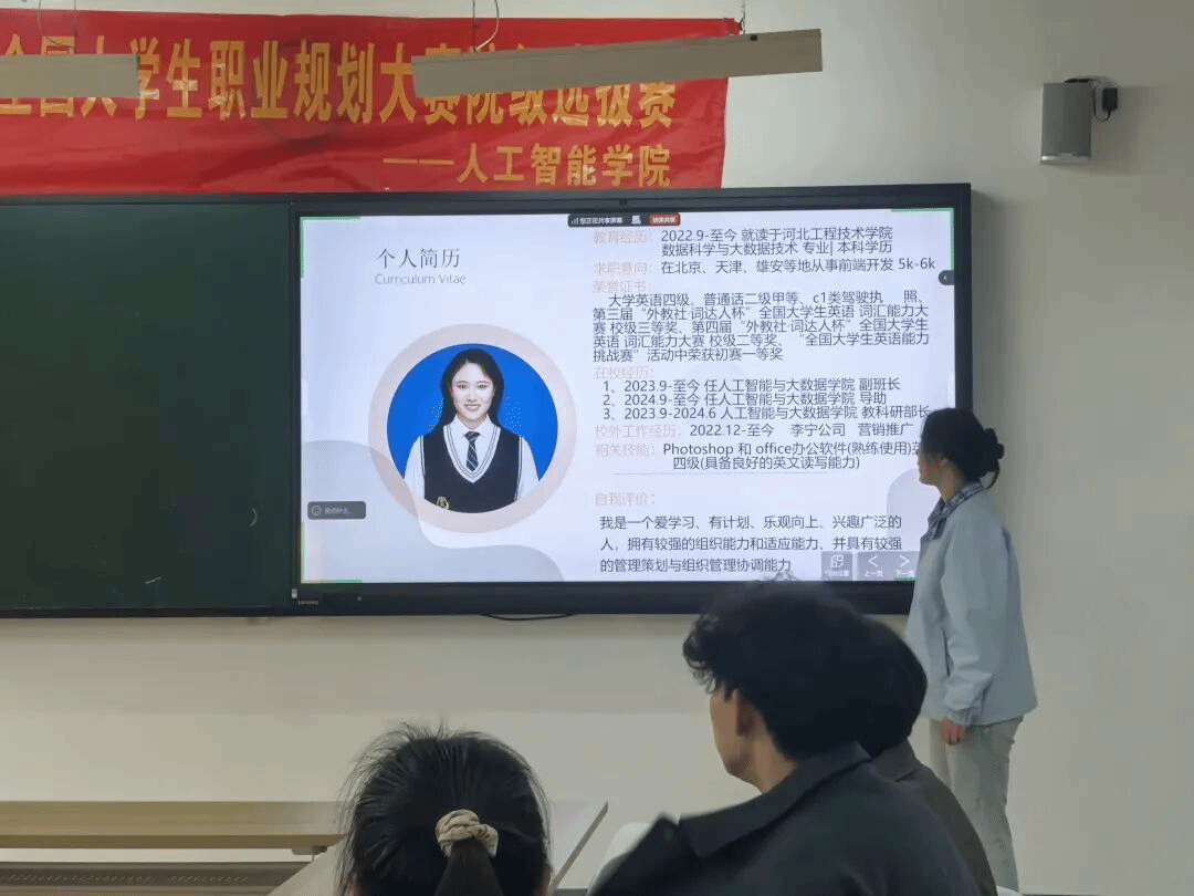 11月3日,就业赛道赛事如期开展。尹钧院长与潘亚静老师在赛前发表动员讲话,帮助在场学生更加深刻地理解就业规划的核心要义。相较于成长赛道,就业赛道的选手展示更加聚焦于“岗位适配性”。选手们针对目标岗位,结合自身的项目经验和技能证书,精心制定了提升计划。