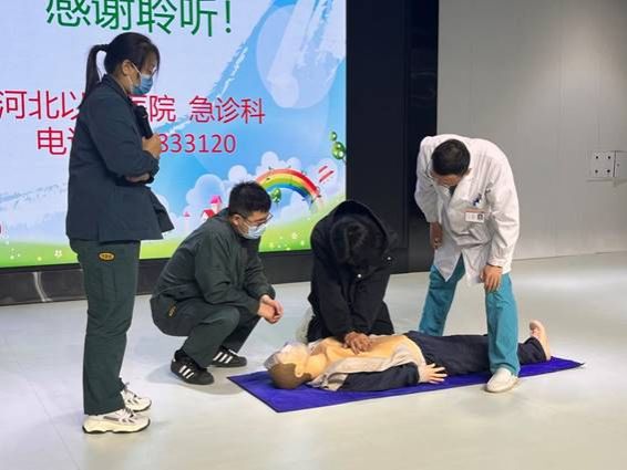 讲座上,医护人员主要围绕校园急救进行科普。对于刀刺伤、外伤出血、交通事故、触电、烧烫伤、异物卡喉、中暑等常见急症应掌握正确的处置流程和方法进行了详细的介绍,讲到在呼救并等待专业医疗队伍前来救治的同时,抓住“黄金时机”应对急症。随后,医护人员现场讲解并示范了心肺复苏的相关步骤和方法,并指出未接受过人工呼吸培训者在实施心肺复苏时,可以仅单纯进行胸外心脏按压,特别要注意对于意识清醒或仍有呼吸、心跳或脉搏体征者,不宜实施心肺复苏。