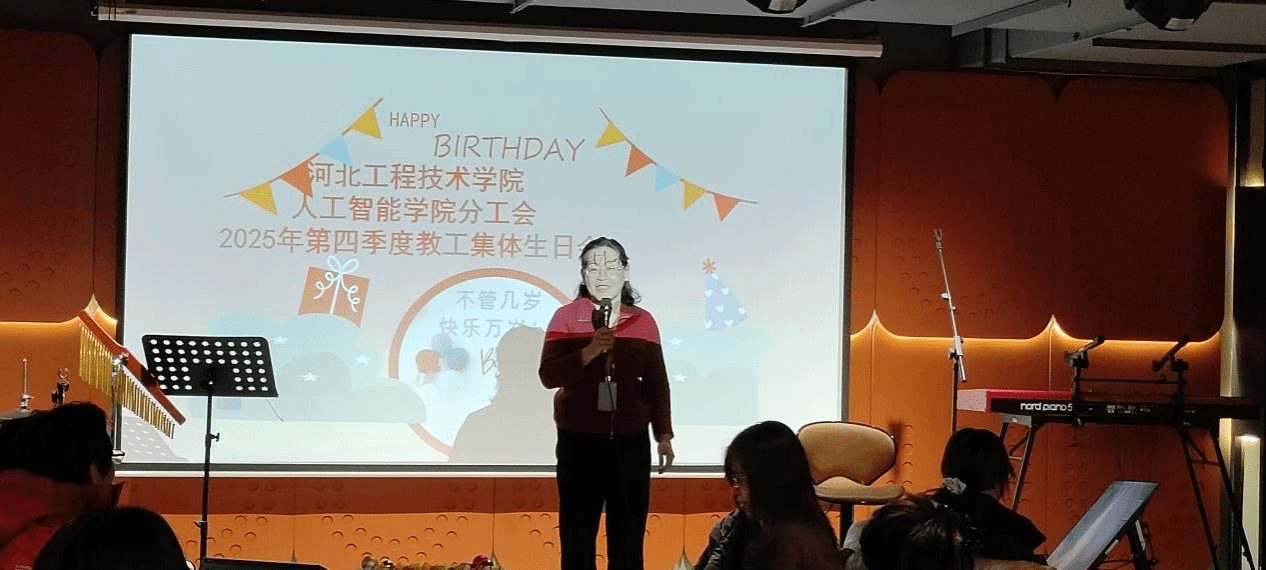 为增加活动的趣味性和互动性,分工会还精心策划了轻松愉快的游戏环节。“看图猜台词”环节,一张张熟悉的影视剧截图引发了老师们的热烈讨论和抢答,现场瞬间变成了一场关于经典记忆的趣味比拼。“听歌识曲”环节更是精彩纷呈,当熟悉的旋律响起,老师们或凝神思索,或脱口而出,掌声与欢笑声此起彼伏。游戏互动不仅考验了老师们的反应速度和知识储备,还在欢声笑语中进一步拉近了彼此的距离。此外,学院教师刘文龙、索昕宇和樊家琦三位老师特别登台,为寿星们献上了一首首动听的歌曲。他们用优美的歌声传递祝福,温暖的歌声与真挚的情谊在会场内回荡。