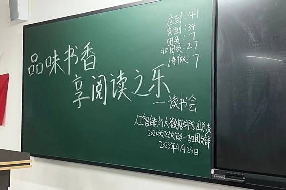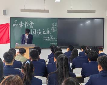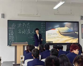 此次"品味书香,享阅读之乐"读书会分为三个部分:第一个部分为准备活动。通过观看课件与团支书讲解,使学生们具体了解此次活动的内容。学生们通过线上和线下两种方式去搜索资料,上网浏览名人名言,线下前往图书馆借阅自己想要分享的图书。学生自发借书,积极参与到活动中来;第二个部分为我行我展。 活动期间,学生们用自己搜寻到的书籍、精彩片段抄录,在读书会上分享自己的心得体会。活动期间学生们侃侃而谈,用诙谐幽默的语言介绍自己分享的书籍;有的用粉笔在黑板上写下精彩语段;有的深入分享自己的读书感受,让学生们增加了对于阅读的兴趣。既激发了学生们的主观能动性,又给学生们留下了深刻印象,引发了读书兴趣,每位同学都参与进来;第三部分为活动总结,围绕活动"品味书香,享阅读之乐"读书会初心,团支书总结了此次活动的主要内容,呼吁本班学生要多读书、读好书。