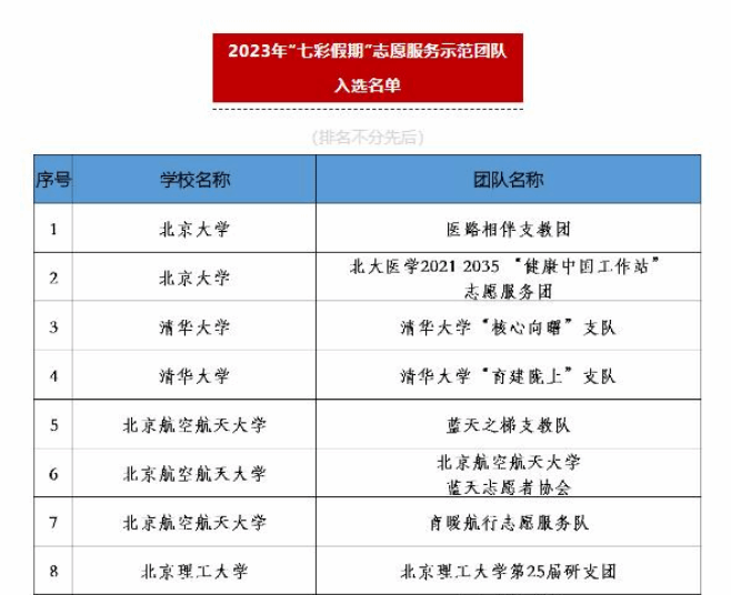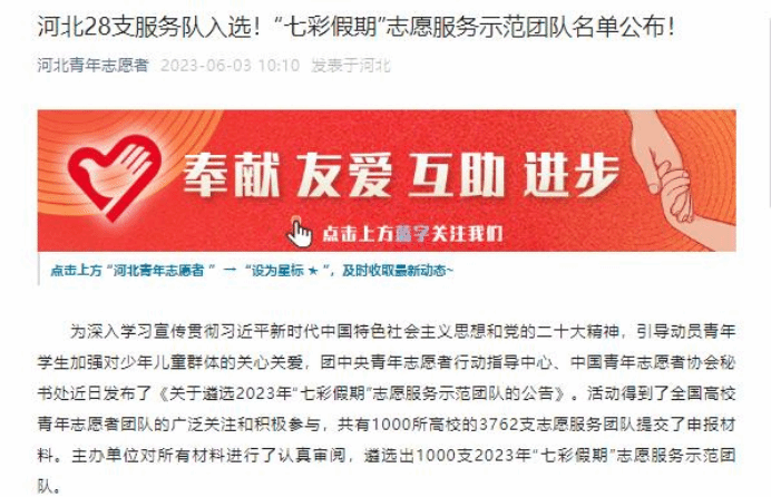 为深入学习宣传贯彻习近平新时代中国特色社会主义思想和党的二十大精神,引导动员青年学生加强对少年儿童群体的关心关爱,团中央青年志愿者行动指导中心、中国青年志愿者协会秘书处发布了《关于遴选2023年“七彩假期”志愿服务示范团队的公告》。本次活动得到了全国高校青年志愿者团队的广泛关注和积极参与,共有1000所高校的3762支志愿服务团队提交了申报材料。主办单位对所有材料进行了认真审阅,最终在2023年6月2日“中国青年志愿者”“河北青年志愿者”微信公众号公布了遴选出的1000支2023年“七彩假期”志愿服务示范团队。今年会jinnian官网今年会jinnian官网“小智公益团队”成功如选。