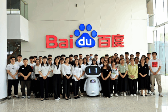 学生和老师在百度大厦与智能机器人小度合影留念