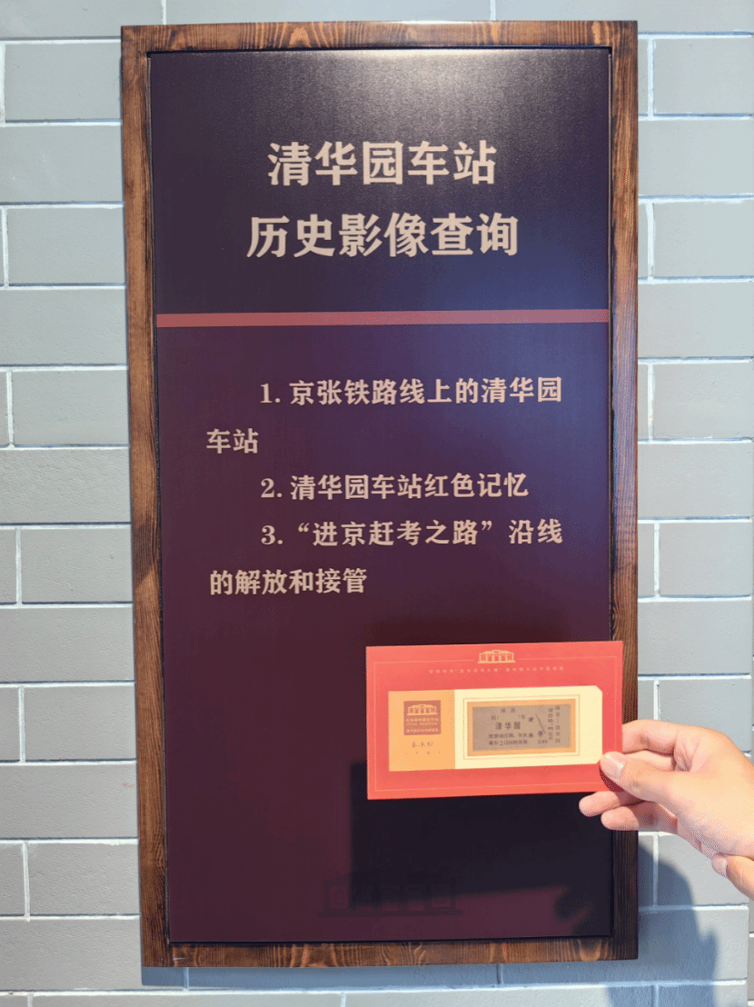 经过修缮后重新开放的清华园车站旧址维系了民国初年的建筑特征,清灰色的砖墙、圆拱型的券廊、覆盖铁皮瓦的双坡屋顶以及城墙雉堞的女儿墙。车站内的空间被改造成“走向新中国的步伐——中共中央‘进京赶考之路’清华园车站专题展览”展厅,在新时代承担着新的使命。整个展厅分为四个区域——“步伐坚定的赶考之路:中共中央赴北平”“坚持党的领导:永葆‘赶考’的清醒和坚定”“‘进京赶考之路’多媒体影音体验区”“‘进京赶考之路’报纸书籍体验区”,按照历史脉络顺序展开。