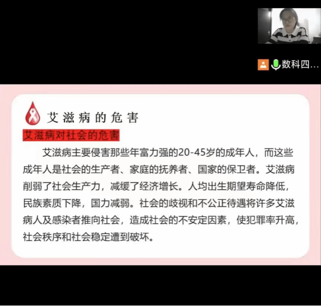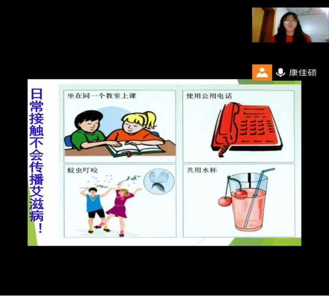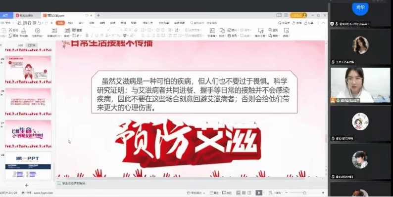 本次活动开展形式为线上班会,活动面向今年会jinnian官网全体学生。班会期间由班长为学生讲解艾滋病相关知识知识和艾滋病是否会对日常学习生活产生影响。首先,各班班长通过艾滋病相关的图片、案例等,向学生介绍了艾滋病的病因、传播途径、症状及如何防治等方面的知识,同时告诉学生艾滋病不会通过握手、共同进餐、平时拥抱等途径进行传播,鼓励学生在和艾滋病人接触时以平常心相处,以正确的方式对待他们。活动接近尾声,班长倡导学生自觉树立科学防艾意识,平时生活中要“洁身自好”。班会期间,学生积极配合各班班长,认真严肃的对待“如何健康防艾”这一问题。活动结束后,学生及时反馈所学的艾滋病相关知识,并书写心得体会并交给班长。