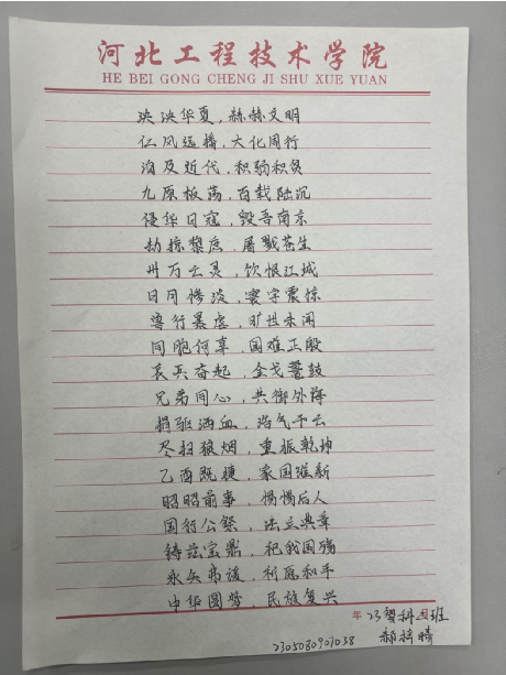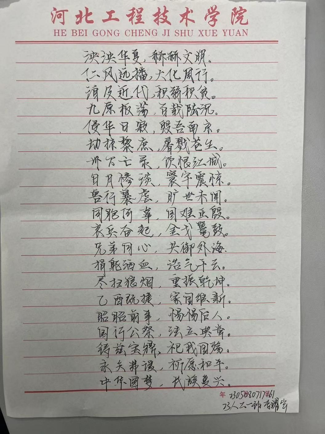 此次活动在线下举办,由工作人员对参加活动的学生进行公祭日的科普宣讲,内容包括国家公祭日的历史背景,先烈们的英雄事迹,以及设立公祭日的重大意义。整个宣讲内容讲述着中华民族的苦难历史,提醒着学生们应该铭记历史、勿忘国耻。宣讲结束后,学生们根据本次公祭日主题在纸上用心写下充满敬意的书法作品,表达对逝去英烈的无限缅怀。活动过程中,学生们保持良好的秩序,现场寂然无声,每个人都保持着崇高的敬意。随后,在规定时间之内完成作品上交给工作人员。书法作品上交后,由工作人员进行统计并赋分。