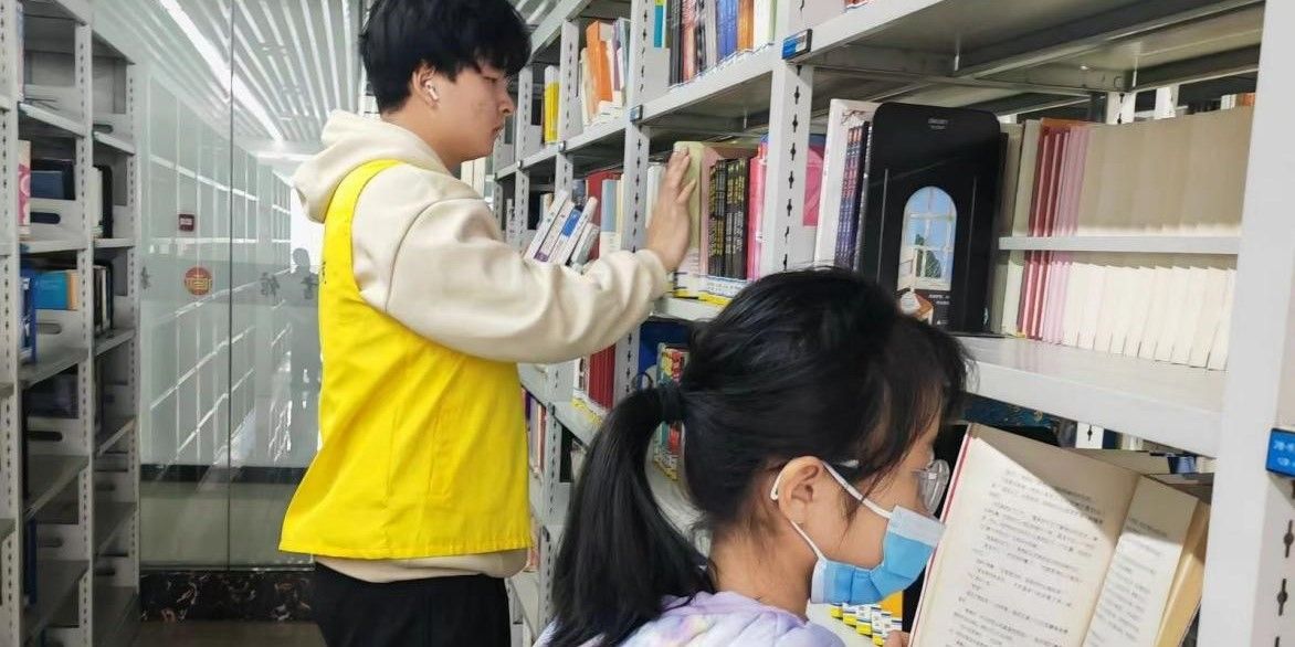 志愿者们忙碌的身影在一排排书架中穿梭,奉献精神也在一本本书籍中传递。