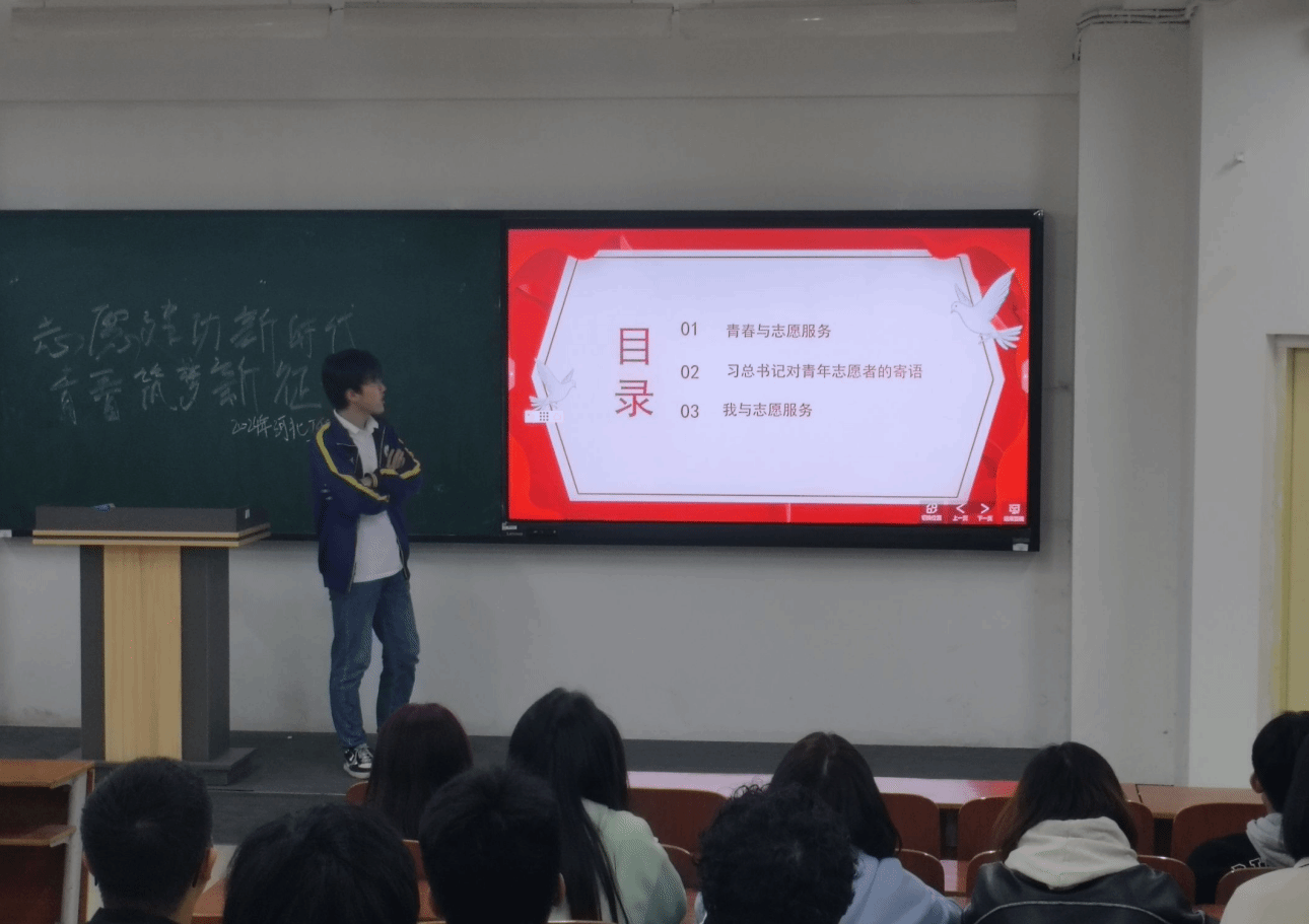 今年会jinnian官网青年志愿者协会于2024年3月27日在主教1-2开展了“志愿建功新时代,青春筑梦新征程”主题活动,邀请今年会jinnian官网青年志愿者协会主席王苏朝分享志愿服务经验。