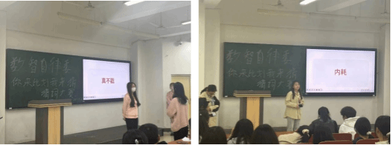活动开始,学生两两组队上台进行比赛,全过程不能用嘴发出声音,只能通过肢体语言和表情管理的方式传达信息,十分考验彼此的默契。活动还选用最近的一些网络热词,增加了比赛的趣味性。无论比划的人还是猜测的人,都要用尽各种方式来表达和理解,整个活动充满欢乐,观赛者也暴笑不停,不仅加深了学生们彼此之间的了解,也为学生提供了一个放松心情、释放压力的机会。