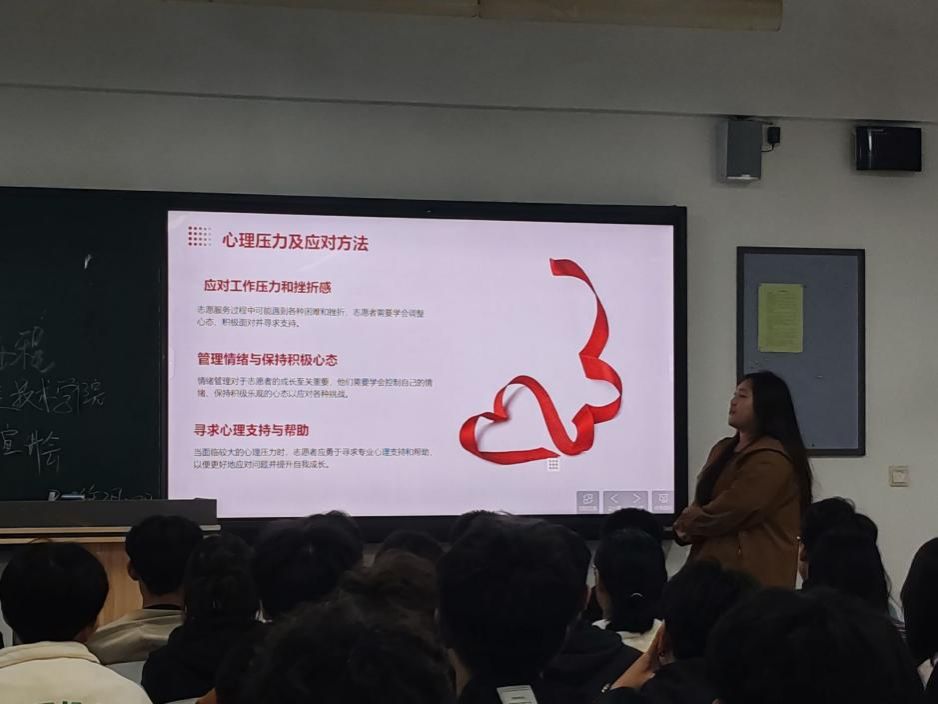 活动开始,主讲人王浩将本次演讲分为五个部分。在演讲开始前,主讲人阐述了志愿者的定义,并提到志愿者在公益活动中扮演着十分重要的角色,由此引出第一部分“为何成为志愿者”,并为学生们指出志愿服务的意义。随后主讲人分享了自己的志愿服务经历,从扶助贫困地区居民到服务社区居民,从植树造林到组织垃圾清理,由远及近,从小到大,丰富的志愿经历使自身得到了许多锻炼。其中尤为重要的是主讲人讲述帮助留守儿童的故事,她为受伤的小女孩涂碘伏,观察到自闭症男孩喜欢叠千纸鹤等等,字里行间流露出真情实感,主讲人说“她从不后悔挤出时间去做志愿服务,在时间的消磨中,他人的微笑便是给予自身最大的动力”。第三部分,主讲人提到了自己在志愿服务中的成长与收获,指出志愿服务的价值,并提出“志愿服务不仅是一种奉献更是一种学习和成长的机会”。