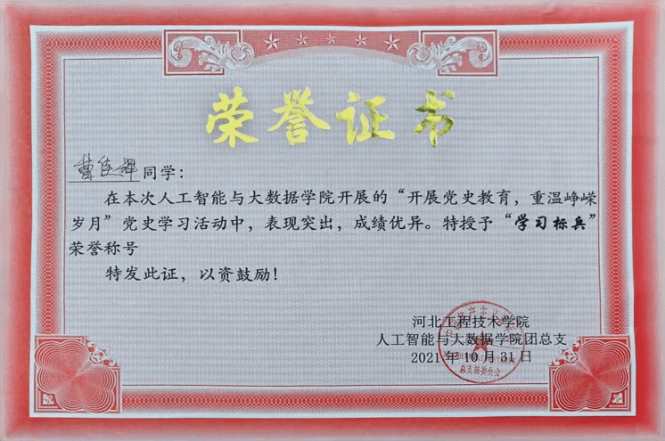 2021年院级“开展党史教育,重温峥嵘岁月”特授予“学习标兵“荣誉称号
