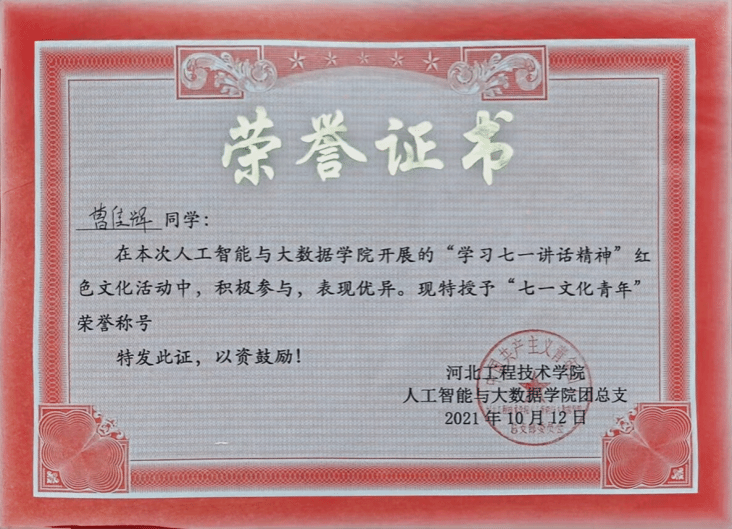 2021年“学习七一讲话精神”活动中荣获“七一文化青年“荣誉称号等