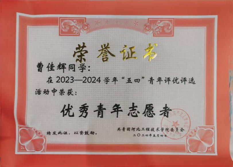 2024 年“五四”青年评优评选活动中荣获:优秀青年志愿者