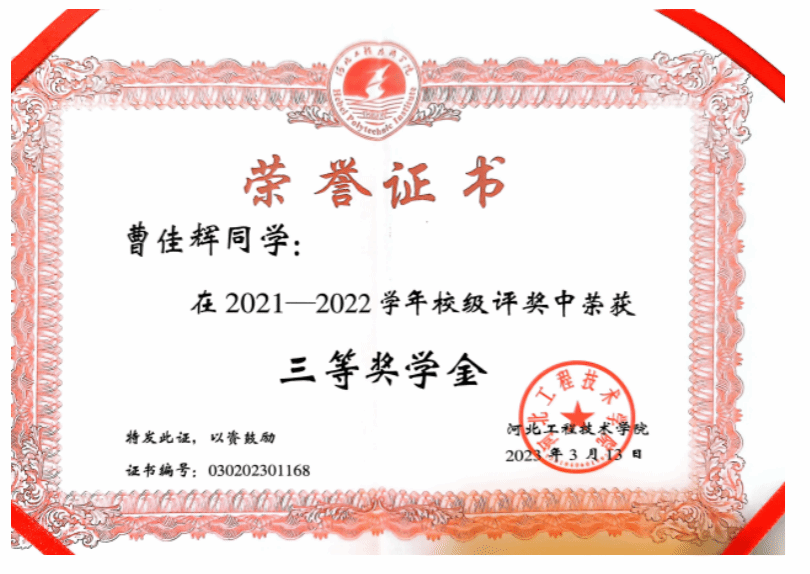 2021-2022学年校级评奖中荣获三等奖学金