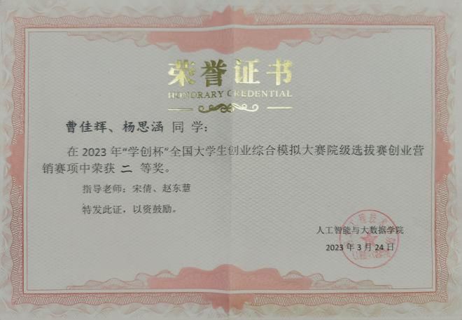 2023年"学创杯”全国大学生创业综合模拟大赛院级选拔赛中获得二等奖