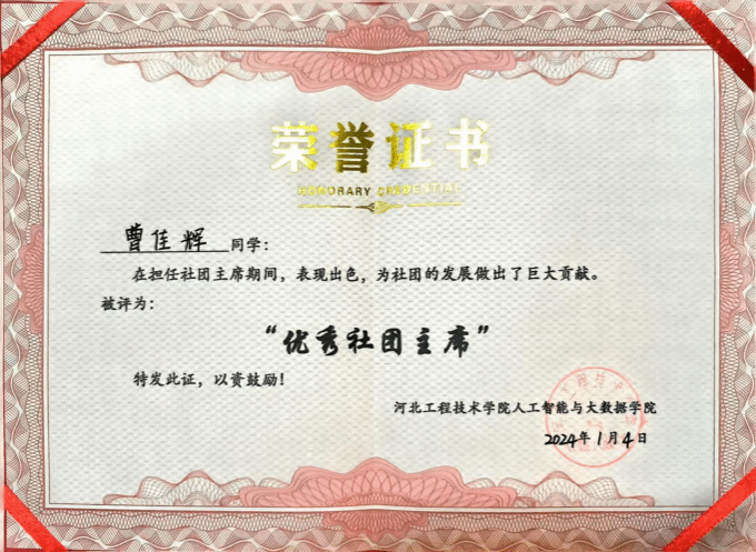 2021级数据科学与大数据技术三班的曹佳辉,女,积极分子,在自身的不懈努力以及老师、同学的热心帮助下,我在各方面获得了显著的进步和一定的成就。在这三年中获得荣誉:校级及以上13项,其中国家级及省级奖项7项;院级奖项11项。