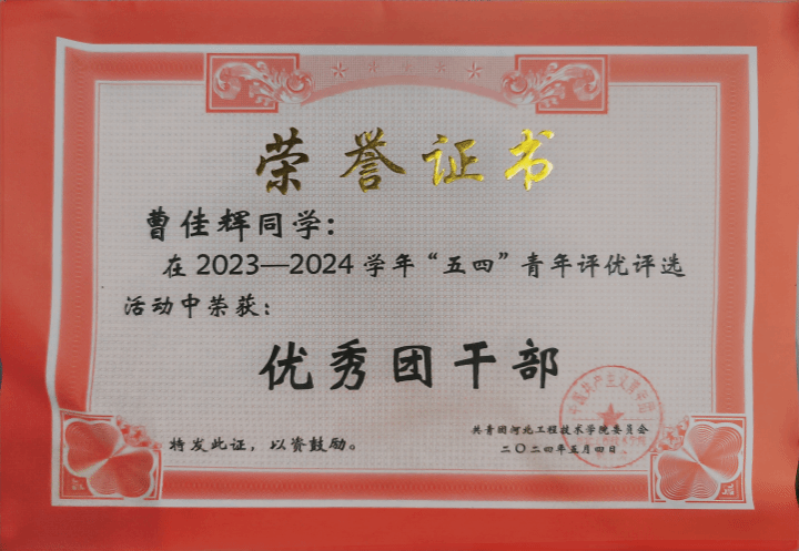 2024 年“五四”青年评优评选活动中荣获:优秀团干部