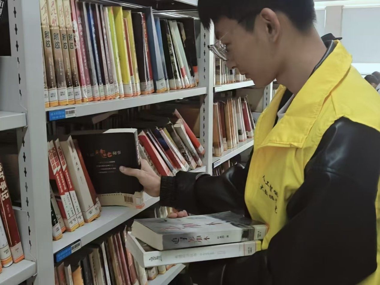 同时,志愿者们也对书架进行了全面清洁与维护,为读者营造了一个更加整洁、舒适的阅读环境。在工作过程中,团队成员分工明确、协作紧密。每位志愿者都以高度的责任心和敬业精神投入到整理工作中,确保任务完成。从浩瀚经典名著到实用科普读物,从童趣盎然的绘本到前沿学术著作,杂乱的书堆在他们手中逐渐化为规整知识“矩阵”,方便读者精准寻书。同时,作为“文化导览员”的志愿者耐心引导新入馆读者熟悉借阅流程、介绍特色阅读区域,以热情消除读者对图书馆的陌生感。
