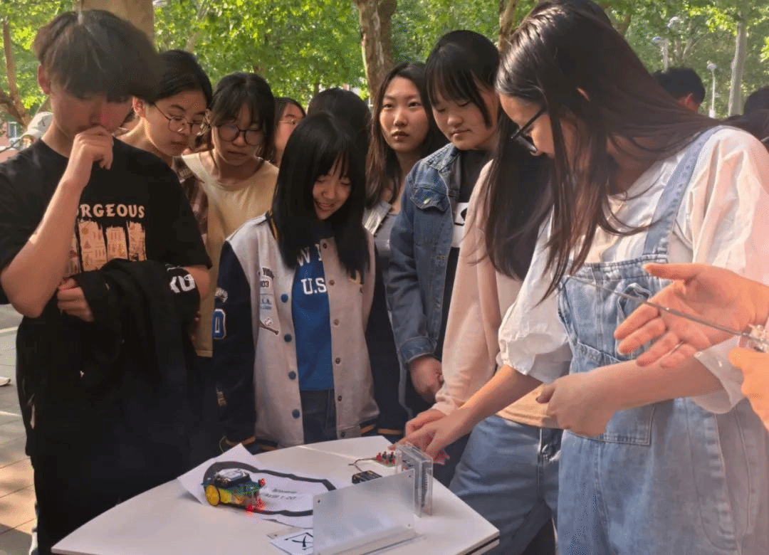 活动现场展出多款智能机器人,涵盖基础型、服务型与互动型多个类别。工作人员引导学生们近距离观察每一款机器人的独特结构与电路设计,详细介绍其功能特点与应用场景。学生们纷纷拍照记录,不时围绕机器人展开热烈讨论,现场气氛活跃而热烈。