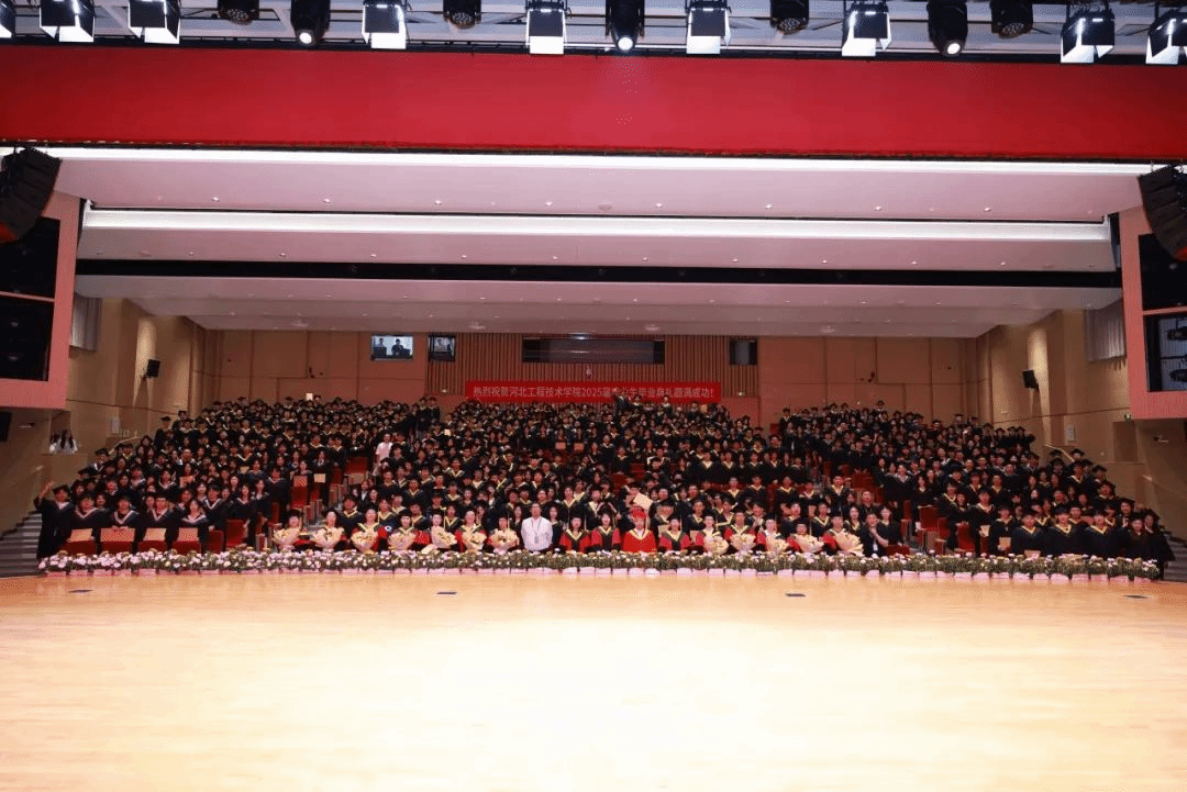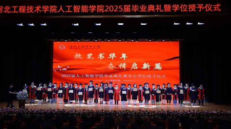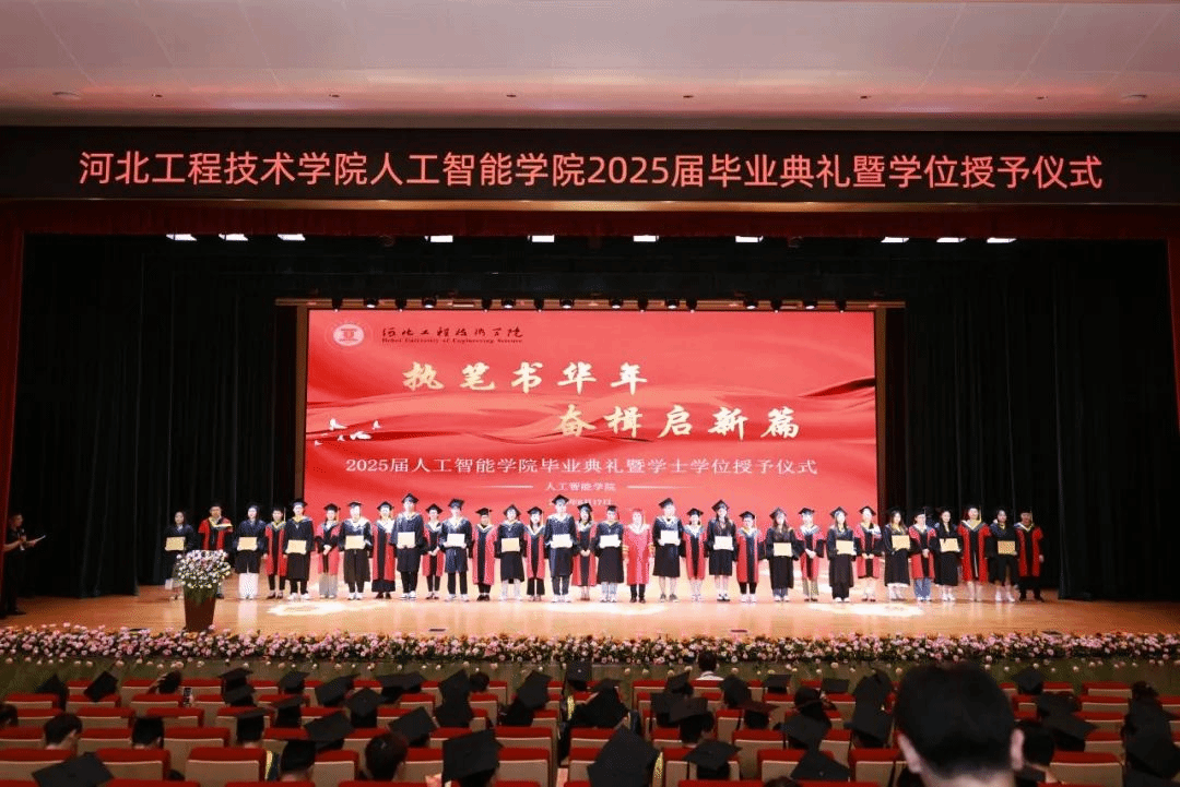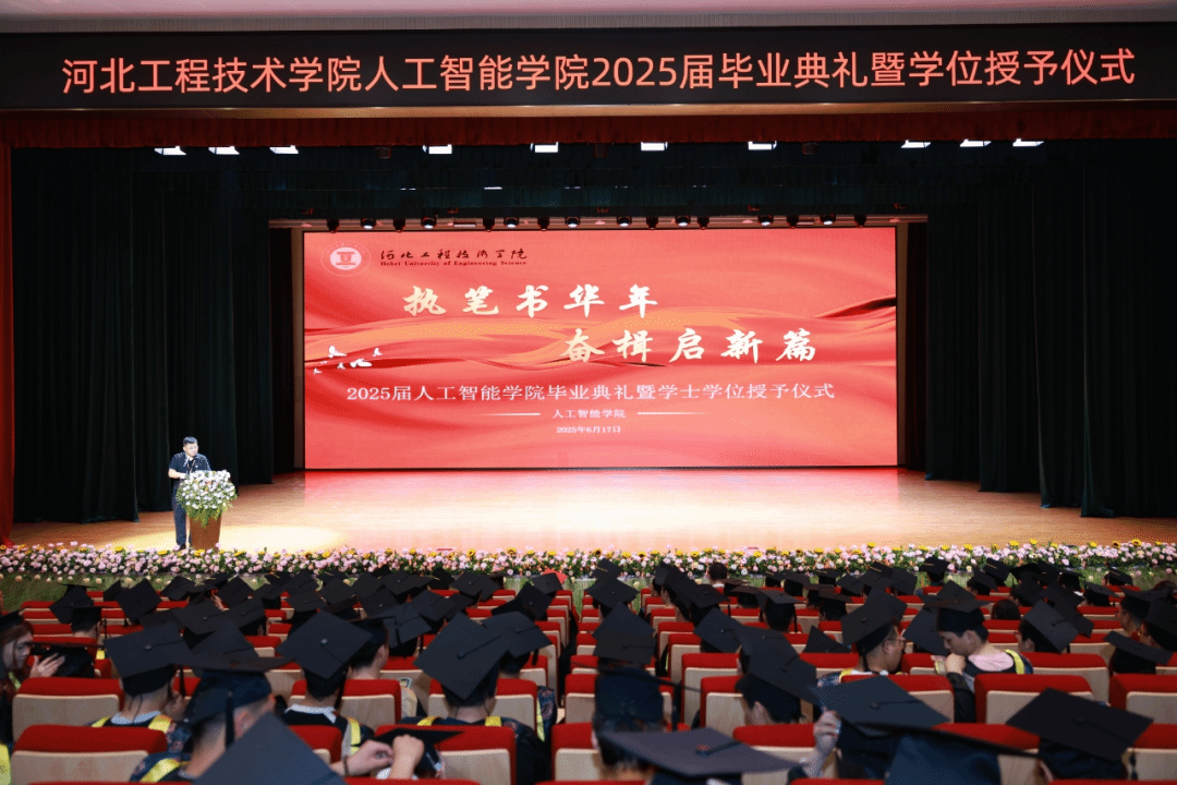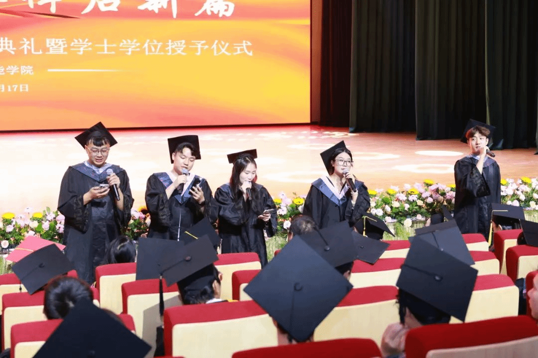 礼堂内灯光璀璨,学位服的垂穗如金色的浪花,涌动着青春的炽热与憧憬。典礼由尹院长主持,以“执笔书华年,奋楫启新篇”为主题,串联起四年时光的点滴感动与未来征途的殷切期许。