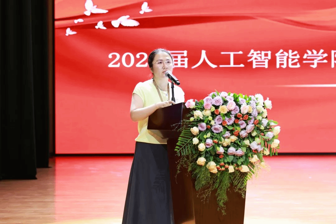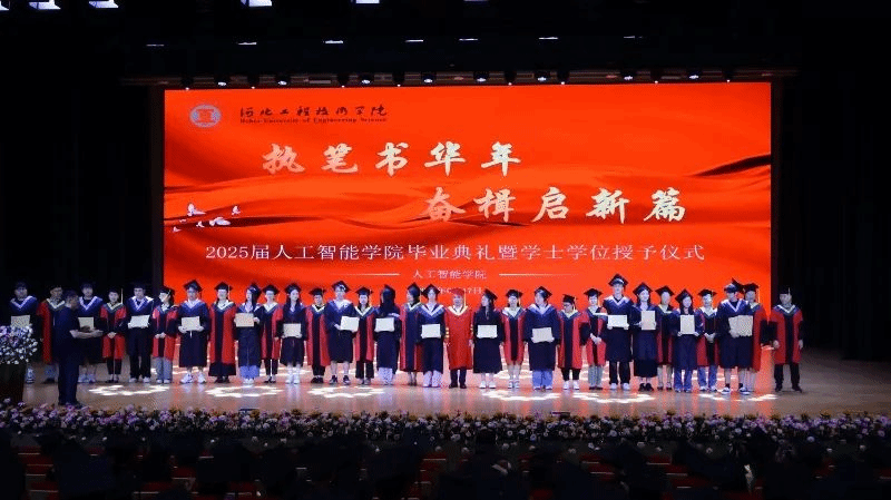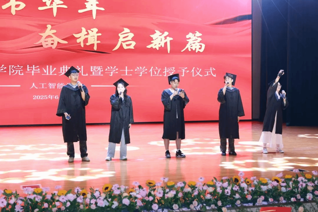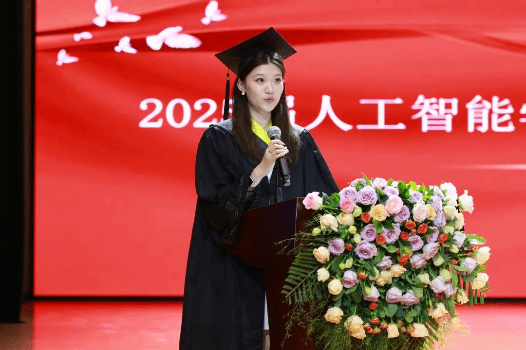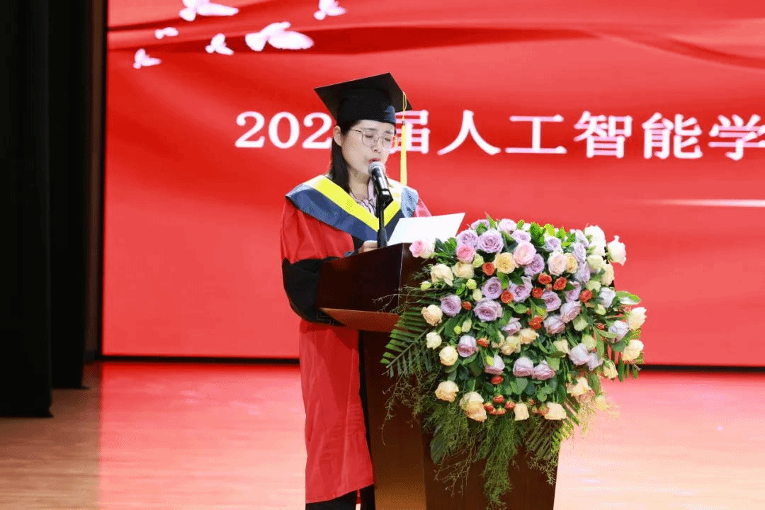 毕业生代表刘佳昕的发言如同一封写给四年青春的情书。“记得大一时在实验室第一次成功运行代码的雀跃,记得备战‘互联网+’大赛时团队连续72小时的坚守,学院的每一寸土地都生长着我们的成长密码。”他特别提及在“产教融合”项目中,企业导师手把手教学的场景,“那种理论与实践碰撞的火花,让我们真正懂得了‘知行合一’的分量。”并以“三个感谢”串联起毕业心绪:感谢导师在毕设瓶颈期“一句点醒梦中人”的点拨,感谢同窗在考研路上“互为星光”的陪伴,更感谢学院“让我们在人工智能的蓝海里敢想敢闯”。他们的发言里,藏着所有毕业生的共同记忆——那些在代码世界里披荆斩棘的日子,终将成为驰骋未来的铠甲。