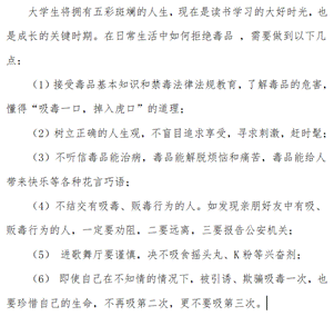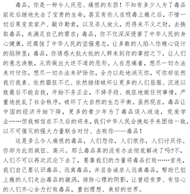 学生能通过此次征文活动,能积极主动收集材料,学习毒品相关知识,提升毒品辨别能力与预防意识,认识到毒品对社会和家庭的危害,了解我国禁毒工作现状,进一步增强学生的禁毒意识,参与到禁毒大军中。同样的,美丽的人生中,当然会有种种诱惑,美丽的诱惑,致命的诱惑,我们应适度抑制自己的好奇,永远不要去接触他们。
