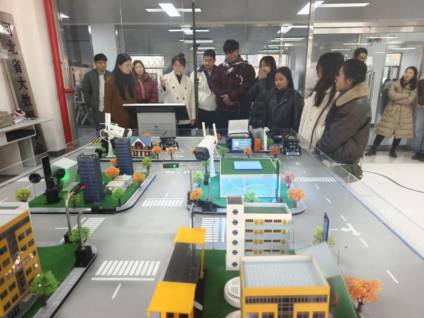 活动当天,学院以开放的姿态迎接泰国皇家理工大学的学生。在学院领导的陪同下,泰国学生首先参观了学院的人工智能实验室。在这里,教师精心准备了一系列展示,包括城市智慧沙盘和月球小车等前沿科技设备。并在参观过程中,利用同步翻译设备为泰国学生详细解说技术原理和应用。