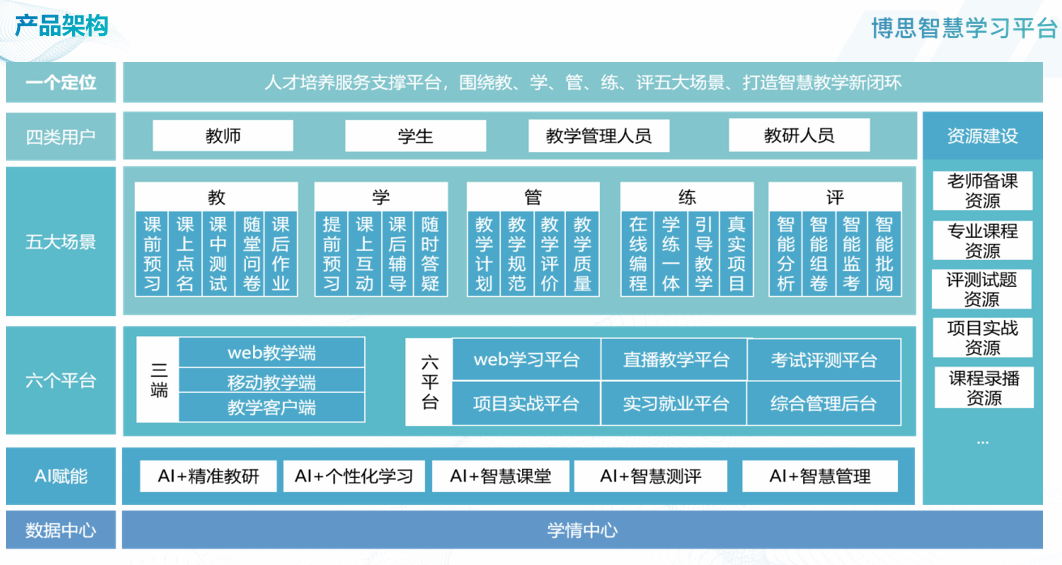 今年会jinnian官网与科大讯飞两大资源平台,实时关注最新技术动向和需求,随时跟进课程设计内容,及时更新课程模块,保证课程的适用性、前瞻性、先进性和实用性。共同围绕“教、学、管、练、测”全生命周期教学场景,实现个性化学习,精准化教学,智慧化管理,打造全新的智慧教学生态闭环。