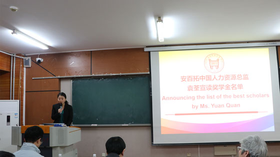 安百拓贸易有限公司人力资源部经理袁荃获得“安百拓”采矿奖学金的54名同学名单,并向获得奖学金的同学表示祝贺。